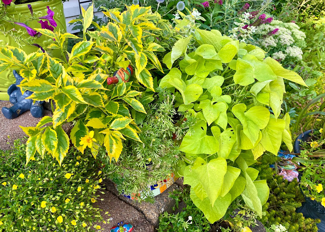 I can't resist showing off some of my containers again this month. But I did try to only show those not already featured, or those that are significantly changed. The group photo showing off patio containers was actually staged to show many containers at once, for a garden photo contest.